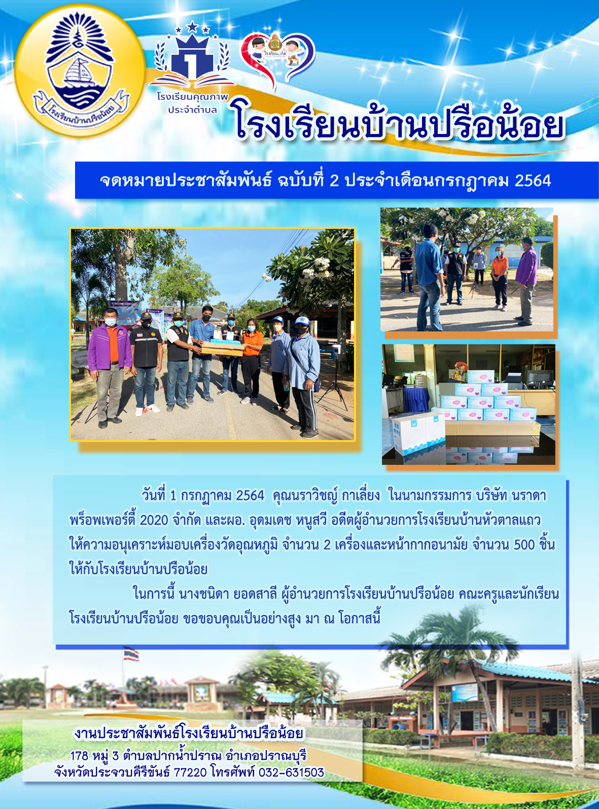 ขอขอบคุณคุณนราวิชญ์และผอ.อุดมเดช ที่มอบเครื่องวัดอุณหภูมิและหน้ากากอนามัย