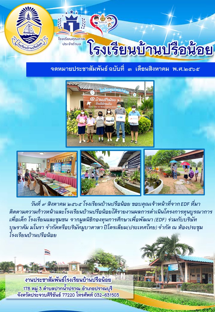 วันที่ 9 สิงหาคม 2565 โรงเรียนบ้านปรือน้อย ขอบคุณเจ้าหน้าที่จาก EDF ที่มาติดตามความก้าวหน้าและโรงเรียนบ้านปรือน้อยได้รายงานผลการดำเนินโครงการทุนบูรณาการเพื่อเด็ก โรงเรียนและชุมชน จากมูลนิธิกองทุนการศึกษาเพื่อพัฒนา (EDF) ร่วมกับบริษัท บุษราคัม มโนรา จำกัดหรือบริษัทมูบาดาลา ปิโตรเลียม(ประเทศไทย) จำกัด ณ ห้องประชุมโรงเรียนบ้านปรือน้อย ????????https://static.xx.fbcdn.net/images/emoji.php/v9/tfb/1/16/1f64f_1f3fb.png" style="border:0px; height:16px; width:16px" />?https://static.xx.fbcdn.net/images/emoji.php/v9/tf4/1/16/2728.png" style="border:0px; height:16px; width:16px" />
